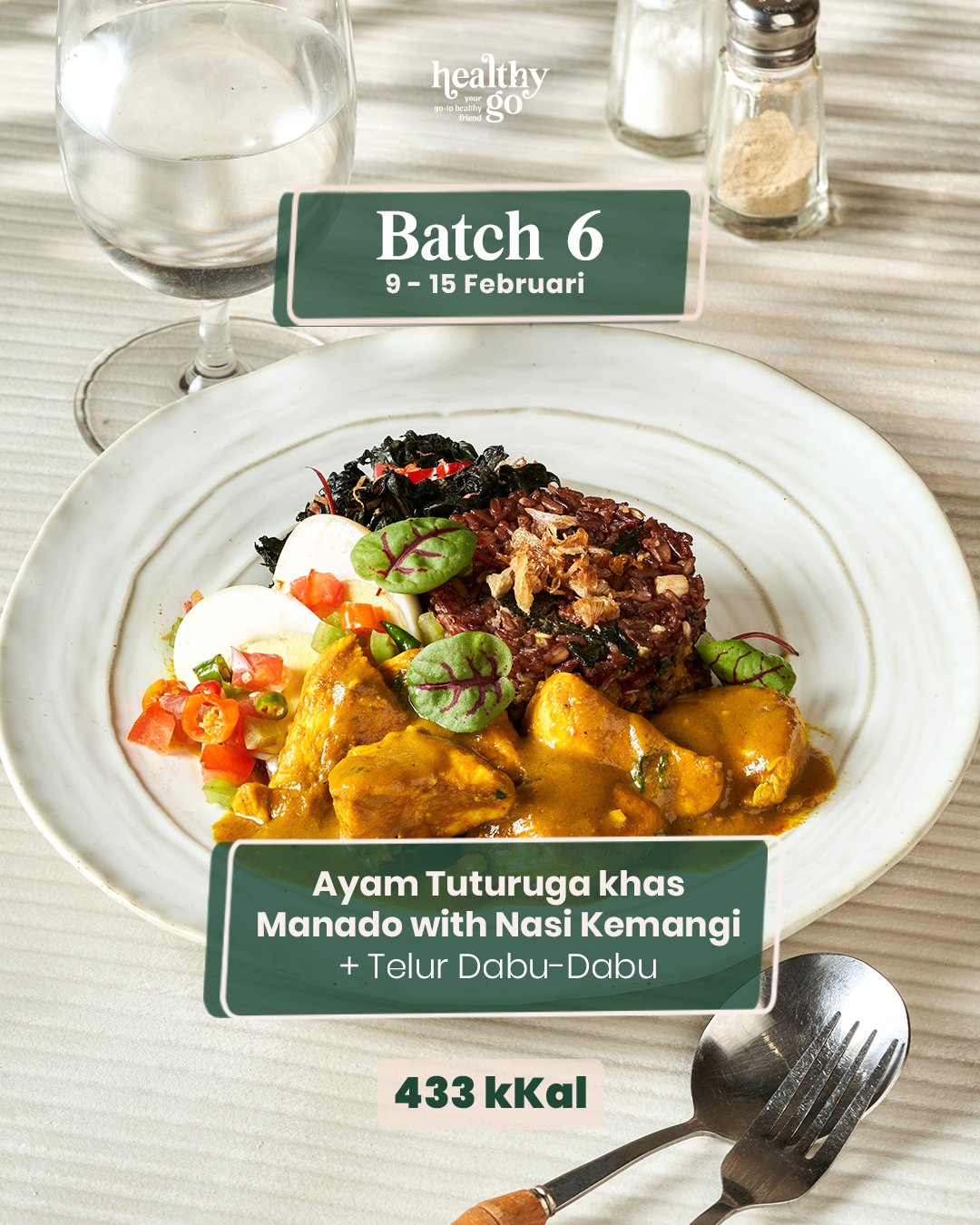 Karbohidrat kompleks: nasi merah, kentang, ubi, pasta, jagung, dll. Protein hewani rendah lemak: ikan, udang, ayam/sapi tanpa kulit & lemak. Sayuran: brokoli, sawi, wortel, kangkung, dll. Dessert sehat rendah kalori (menu tertentu).
