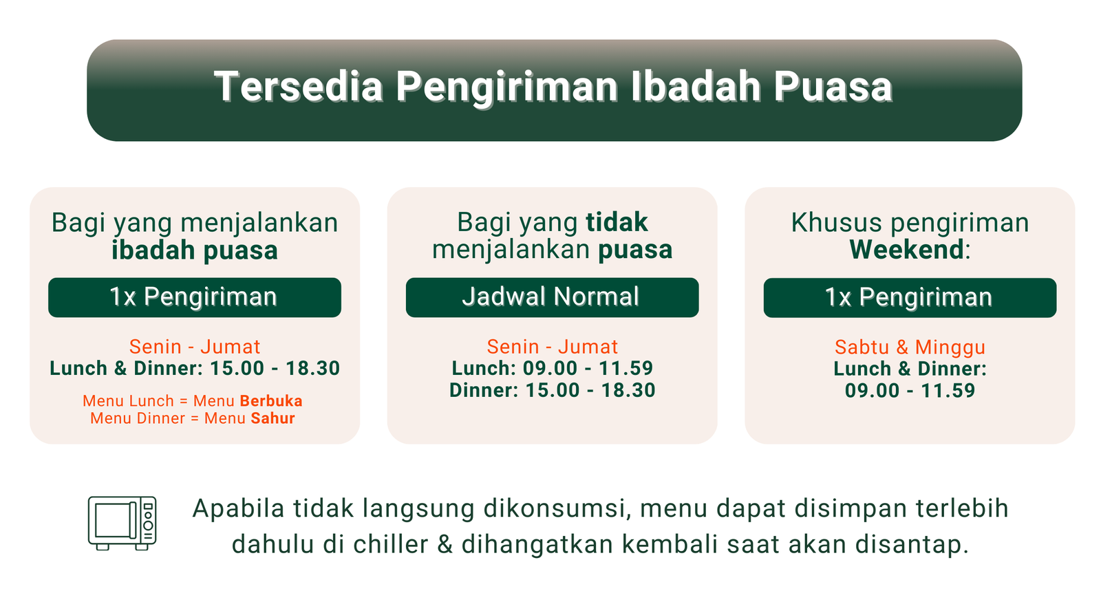 Healthy Go melayani pengantaran Lunch pada pukul 09.00 – 11.59 dan Dinner pada pukul 15.00 – 18.30 untuk hari Weekdays (Senin-Jumat) dan pengantaran Lunch dan Dinner pada pukul 09.00 – 11.59 untuk hari Weekend (Sabtu&Minggu).