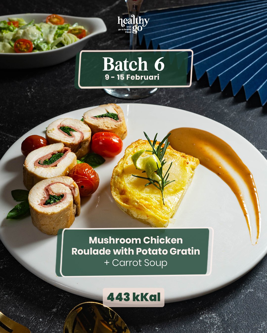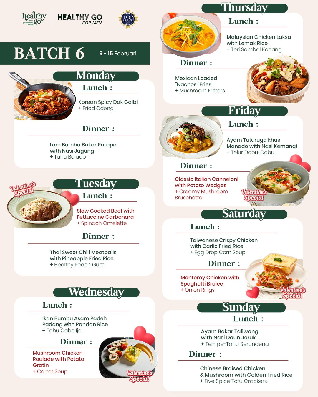 Karbohidrat kompleks: nasi merah, kentang, ubi, pasta, jagung, dll. Protein hewani rendah lemak: ikan, udang, ayam/sapi tanpa kulit & lemak. Sayuran: brokoli, sawi, wortel, kangkung, dll. Dessert sehat rendah kalori (menu tertentu).